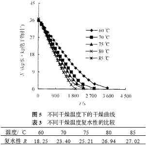 圖5顯示,溫度越高,經相同時間干燥物料的含水量就越低。這是由于溫度越高,空氣相對濕度就越低,空氣與物料之間的濕度差就越大,使得傳熱推動力—溫度差、傳質推動力—濕度差就越大,干燥速度也就越大,要達到一定的含水量所需時間就越短。因此,提高干燥溫度對過程有利。由圖6 可見,在恒速干燥過程中,從60 ℃到70 ℃,它的恒速速率增幅較大,以后速率增幅就逐漸減小,從熱量損耗考慮,干燥溫度就不宜過高。再由表3 得出,雖然隨著干燥溫度的升高復水性也隨之增大,但由于在80 ℃和85 ℃干燥情況下復水性相差不大,鑒于物料為熱敏性,溫度過高營養成分被破壞得越多,因此溫度以80 ℃干燥為宜。