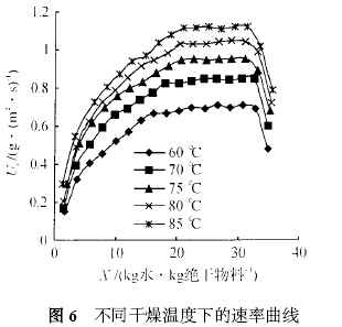 在調整段,氣固兩相進行傳熱和傳質,熱空氣傳給西芹的熱量,一部分用于提高西芹片的溫度,使其由初始溫度逐漸提高到熱空氣狀態下的濕球溫度;另一部分熱量用于汽化水分,故西芹片含水率下降較慢,干燥速度上升,該段所需時間較短。在恒速干燥段,西芹片維持熱空氣狀態下的濕球溫度不變,熱空氣傳遞給西芹片的熱量全部用于汽化水分,含水率呈直線下降,干燥速率基本保持不變。此階段是干燥過程的主要階段,所用時間較長,說明其內部組織結構比較疏松,干燥時內部水分的擴散阻力較小,其內部水分擴散速率大于表面水分蒸發速率。一般而言,恒速干燥階段越長,制品的品質越好。在降速干燥段,西芹片內部水分移動到表面的速度趕不上表面水分的汽化速率,表面局部出現“干區”,進而表面都成為干區,非結合水分全部除去,接下去所汽化的是結合水。此時熱空氣傳遞的熱量,一部分用于汽化水分,一部分用于提高西芹片的溫度,故西芹片含水率下降速度變慢,從圖線上可看出有兩個降速階段[5 ] 。同時,由圖可見,風溫越高,風速越大,切片越薄,載量多層,干燥速率就越大,且風溫是各個因素之中對干燥速率影響效應^大的。
