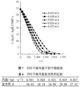 如圖7 、8 所示,風量越大,經相同時間干燥物料的含水量越低。其原因是風量越大,空氣中的含水量越小,空氣與物料間的濕度差就越大,同時邊界層減薄,傳熱系數增大干燥速度也就越大。因此,提高風量對干燥過程有利,但風量越大能量損耗也越大。表4 顯示,不同風速下復水性有差別,但相差不大,綜合考慮,以0. 021m3 / s (1. 34 m/ s) 干燥為佳。