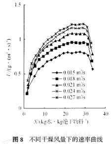 2. 2. 2 不同風量對干燥過程的影響 片狀的西芹經90 ℃的熱水燙漂3 min 后,在干燥溫度80 ℃(濕球溫度42 ℃,相對濕度Φ= 0. 33) 、裝載1. 75 kg/ m2的條件下考察了風量分別為0. 015 m3 / s (0.92 m/ s) 、0.018 m3 / s ( 1.14 m/ s) 、0.021 m3 / s ( 1.34 m/ s) 、01024 m3 / s (1.51 m/ s) 、0. 027 m3 / s (1.69 m/ s) 對干燥過程的影響,得到干燥曲線見圖7 ,速度曲線見圖8及復水性見表4 ,感官指標差別不明顯。