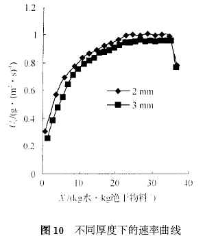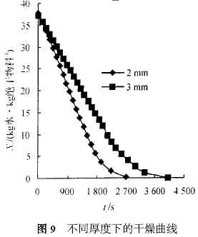 2. 2. 3 不同物料厚度對干燥過程的影響 在干燥溫度為80 ℃、風量為0. 021 m3 / s、裝載1. 75 kg/m2 、片狀的條件下,分別考察了厚度為2 mm、3 mm物料的干燥過程,干燥曲線見圖9 和速率曲線見圖10 ,感官指標差別不明顯。