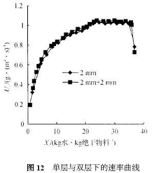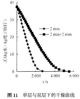 如圖11 、圖12 所示,物料雙層與單層要達到相同的含水率,雙層所需的干燥時間要大,這是由于物料層厚,傳遞阻力大;但雙層的干燥速度比單層的大。這是因為干燥速度是單位時間單位面積上的水分揮發量,水分的揮發量與總物料量有關。只要傳熱速度足夠快,裝載量越多,干燥速度就越高。在實際生產過程中, 需要結合經濟因素考慮合適的裝載量,可以選擇多層物料干燥。