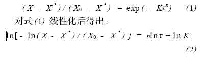 式中: X為干基含水量,kg水/ kg絕干料; X0 為初始含水量,kg水/ kg絕干料; X3 為平衡含水量, kg 水/ kg絕干料;τ為時間, s ; K、n為方程參數。將實驗數據分別在ln[ - lnMR ] 與lnτ坐標上畫圖, MR = ( X -X3 ) / ( X0 - X3 ) , 得到方程的斜率即為n , 截距為ln K。