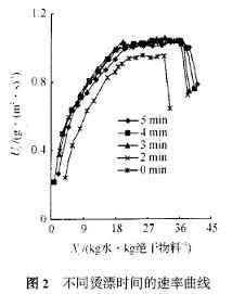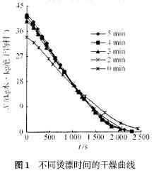 2. 1. 1 燙漂時間對干燥的影響 在燙漂溫度90 ℃、干燥溫度80 ℃(濕球溫度為42 ℃,相對濕度Φ=0.33) 、風量0. 021 m3 / s (風速1. 34 m/ s ,下同) 、裝載量1. 75 kg/ m2 、西芹為片狀(約2 mm 厚) 的條件下考察了燙漂時間分別為0 、2 、3 、4 、5 min 對干燥過程的影響,得到各條件下的干燥曲線見圖1 ,速度曲線見圖2 及復水性見表1 。