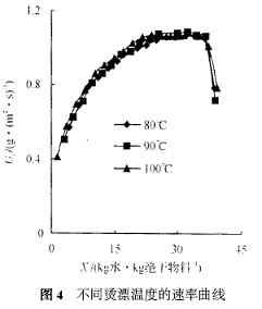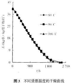 2. 1. 2 燙漂溫度對干燥的影響 在燙漂時間3min 、干燥溫度80 ℃(濕球溫度42 ℃,相對濕度Φ=0.33) 、風量0. 021 m3 / s (1. 34 m/ s) 、裝載量1. 75kg/ m2 、片狀的條件下, 考察了燙漂溫度為80 ℃、90 ℃和100 ℃時對干燥過程的影響。干燥曲線見圖3 ,速率曲線見圖4 ,復水性如表2 所示,感官指標差別不明顯。