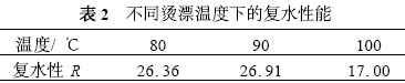 圖3 、4 顯示,在其他條件相同的情況下,燙漂溫度在80 ℃、90 ℃和100 ℃下,干燥速度沒有明顯的差別,在90 ℃時干燥速度為^好。從表2 可得,燙漂溫度在100 ℃時的復水性^差,分析是由于溫度過高對西芹的細胞組織結構產生了破壞而導致組織糜爛,復水差。比較80 ℃和90 ℃下的復水性,可知90 ℃下復水性略好,故^佳燙漂溫度可選為90 ℃。