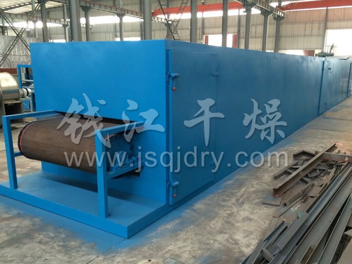 物料由加料器均勻地鋪在網(wǎng)帶上,網(wǎng)帶一般采用12-60目不銹鋼絲網(wǎng),由傳動裝置拖動在干燥機(jī)內(nèi)移動。干燥機(jī)由若干單元組成,每一單元熱風(fēng)獨(dú)立循環(huán),部分尾氣由專門排濕風(fēng)機(jī)排出,廢氣由調(diào)節(jié)閥控制,熱氣由下往上或由上往下穿過鋪滿物料的網(wǎng)帶完成熱量與質(zhì)量傳遞的進(jìn)程,帶走物料水份。網(wǎng)帶緩慢移動,運(yùn)行速度可根據(jù)物料溫度自由調(diào)節(jié),干燥后的成品連續(xù)落入收料器中。上下循環(huán)單元根據(jù)用戶需要可靈活配備,單元數(shù)量亦可根據(jù)需要選取。