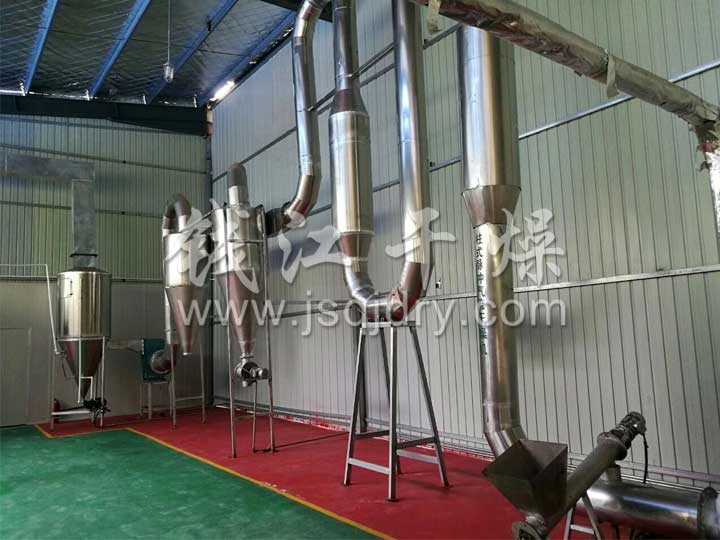 本機特別適合含濕量比較大的,濕物料呈膏糊狀,用其他氣流干燥方法無法干燥的物料,例如:白碳黑、醋酸乙烯及氯乙烯的共聚物,醋酸纖維絮,催化劑、 C.M.C、 CT—1樹脂、鍛石膏、電解二氧化錳、蒽醌磺酸銨鹽、氟石、硅藻土、硅膠催化劑、骨粉、高領(lǐng)土、過氯酸鉀磺銨類藥物、合成樹脂、活性面筋、活性白土、化學(xué)濾餅、金紅石型鉆白粉、癸二酸、硫酸銅、硫酸鋁、硫酸鈉、磷酸鈣、磷酸酯化淀粉、染料、檸檬酸鈣、煤泥、面圍形的面包加料米糠、粘土、粘土水泥、尿素、膨潤土、球形粘土、氫氧化鋁、氫氧化鋇、乳酸鈣、食品、水洗高領(lǐng)土、三聚氰酸、石膏槳、石灰、生物制品、碳黑、碳酸鈣漿、污泥渣、有機化學(xué)品硬脂酸鋁、氧化鐵、有機燃料、玉米蛋白飼料、陰濕泥漿、云母粉、藥劑、顏料、重鉻酸鉀紙漿、酒糟渣等。