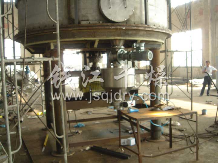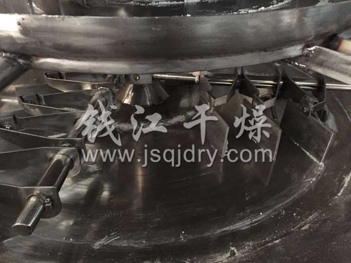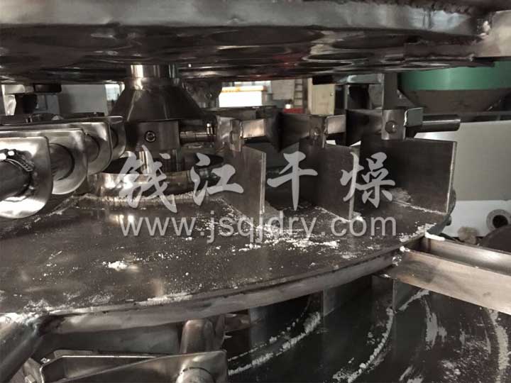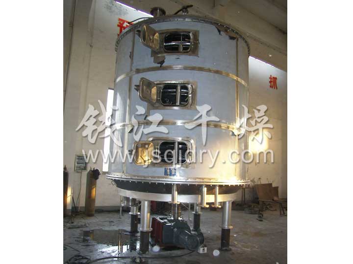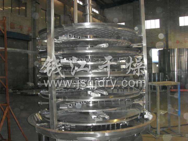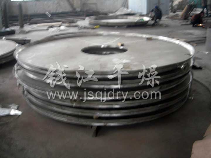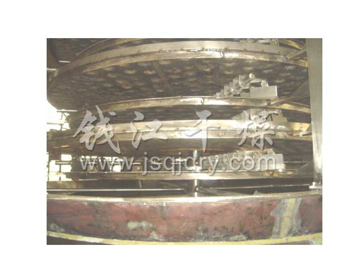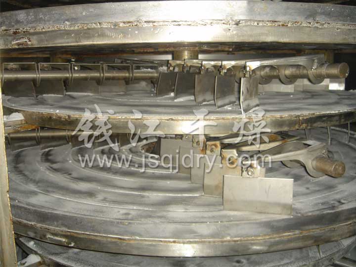 濕物料自加料器連續(xù)地加到干燥器上部^層干燥盤上,帶有耙葉的耙臂作回轉(zhuǎn)運(yùn)動(dòng)使耙臂作回轉(zhuǎn)運(yùn)動(dòng)使耙葉連續(xù)地翻抄物料。物料沿指數(shù)螺旋線流過干燥盤表面,在小干燥盤上的物料被移送到外緣,并在外緣落到下方的大干燥盤外緣,在大干盤上物料向里移動(dòng)并從中間落料口落如下一層小干燥盤中。大小干燥盤上下交替排列,物料得以連續(xù)地流過整個(gè)干燥器。中空的干燥盤內(nèi)通入加熱介質(zhì),加熱介質(zhì)形式有飽和蒸汽、熱水和導(dǎo)熱油,加熱介質(zhì)由干燥盤的一端進(jìn)入,從另一端導(dǎo)出。已干物料從^后一層干燥盤落到殼體的底層,^后被耙葉移送到出料口排出。濕份從物料中逸出,由設(shè)在頂蓋上的排濕口排出,真空型盤式干燥器的濕氣由設(shè)在頂蓋上的真空泵口排出。從底層排出的干物料可直接包裝。通過配加翅片加熱器、溶劑回收冷凝器、袋式除塵器、干料返混機(jī)構(gòu)、引風(fēng)機(jī)等輔機(jī),可提高其干燥的生產(chǎn)能力,干燥膏糊狀和熱敏性物 料,可方便地回收溶劑,并能進(jìn)行熱解和反應(yīng)操作。