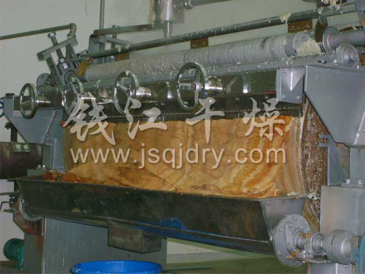 滾筒干燥機(jī)是一種內(nèi)加熱傳導(dǎo)型轉(zhuǎn)動連續(xù)干燥設(shè)備。旋轉(zhuǎn)的滾筒通過其下部料槽,粘附著一厚度的料膜,熱量通過管道輸送至滾筒內(nèi)壁,傳導(dǎo)到滾筒外壁,再傳導(dǎo)給料膜,使料膜中的濕得到蒸發(fā)、脫濕、使含濕分的物料得到干燥。干燥好的物料被裝置在滾筒表面的刮刀鏟離滾筒,到置于刮刀下方的螺旋輸送器,通過螺旋輸送器將干物料集中、包裝。