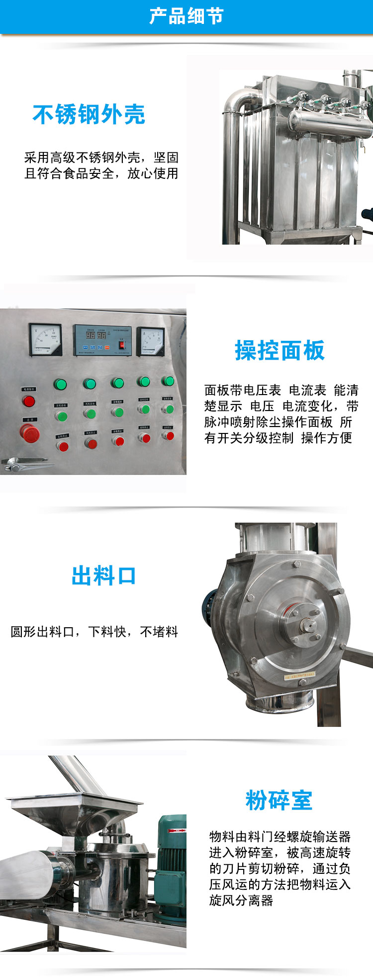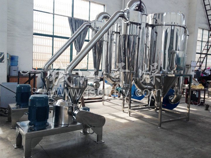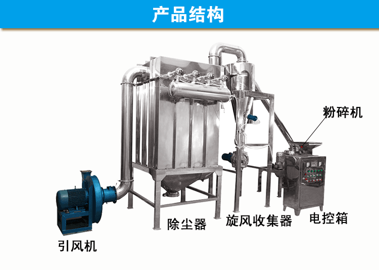 各型號(hào)超微粉碎機(jī)組都含主機(jī)、可調(diào)速的螺旋送料器、旋風(fēng)收集器加氣錘震蕩裝置、袋式除塵箱加氣流脈沖裝置、引風(fēng)電機(jī)造成負(fù)壓。大功率引風(fēng)電機(jī)不但可使輸送管道形成負(fù)壓,使達(dá)到要求的細(xì)粉自動(dòng)被風(fēng)力吸入管道,而且巨大的風(fēng)量還帶走了粉碎腔內(nèi)不斷產(chǎn)生的熱量,同時(shí)對(duì)粉碎機(jī)組的管道起到一個(gè)強(qiáng)有力的清理效果。旋風(fēng)收集器出料口加裝了關(guān)風(fēng)機(jī),出粉口無粉塵飛揚(yáng),達(dá)到了清潔、環(huán)保、節(jié)約的效果。