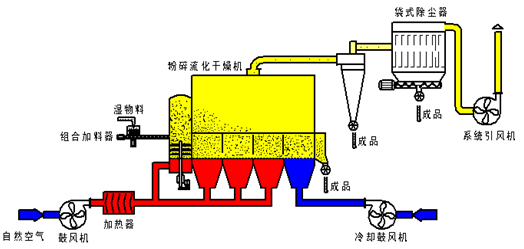 粉碎流化床干燥機系統由熱風類干燥介質生成裝置(燃煤、燃油、 燃氣、蒸汽、電)、粉碎流化床主機、分離設備(旋風分離器、袋 式除塵器、濕法除塵器的組合)、風機、控制系統等組成。可實現 連續或間歇操作,適用于干燥產品的批量化生產。