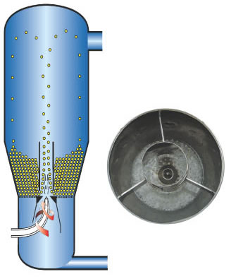 ◆倒錐體容器減速和中部加速圓管設計,可進行微粒、小粒、大粒、微丸包衣