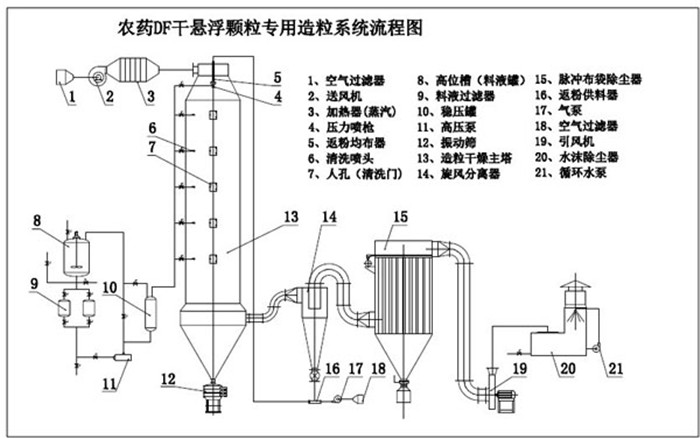 全自動DF干懸浮顆粒劑造粒系統,是生產農藥干懸浮劑(DF)的專用設備。是農藥經濕法砂磨,然后將研磨好的懸浮液用壓力式霧化器于干燥室內的熱氣流中,使水份迅速蒸發制成細小干燥顆粒的方法。在數秒鐘內即完成料液的濃縮、干燥、造粒過程。