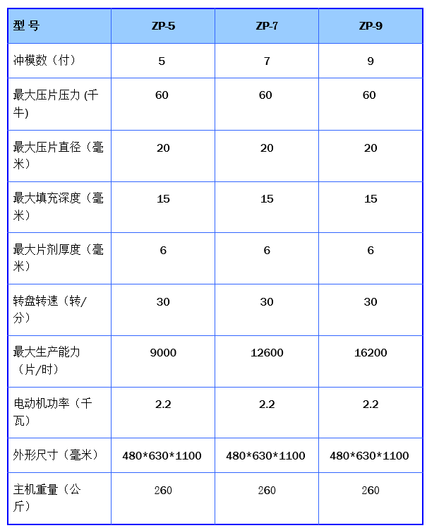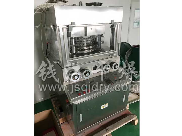 本機是一種單壓式自動旋轉,連續壓片的機器,將顆料狀原料壓制成各種片劑。ZP-5旋轉式壓片機主要用于制藥業的片劑生產,同時適用于化工、食品、電子等工業部門。ZP-5旋轉式壓片機外圍罩殼為全封閉形式,材料采用不銹鋼,內部臺面用不銹鋼材料,轉臺表面經過特殊處理,能保持表面光澤與防止交叉污染。ZP-5旋轉式壓片機裝有透明玻璃的門窗,能清楚觀察壓片的狀態,并且能全部打開,易于內部清理和保養。所有控制器和操作件均布局合理。采用變頻調速裝置進行電氣調速,操作方便,轉動平穩,安全準確。所有的傳動裝置均布置在機器內部,保持機件清潔。配有過載保護裝置,當壓力過載時,能自動停機。本機配有電磁制動電動機和其它安全保護裝置,運行時也能調整與操作。
