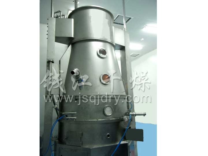 側噴:側噴裝置由一個上下移動但無孔的轉盤取代了篩板。物料在其自身重力、入風氣流的推力、轉盤旋轉的離心力作用下形成流化狀態,其運動為螺旋狀。液體通過安裝在料斗側壁上的氣動噴嘴加入到系統中,其方向與物料運動方向一致,呈切線狀噴入。