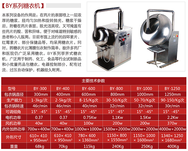3. 包衣機(jī)直徑:300 mm 4. 主電機(jī)功率: 0.37 kw