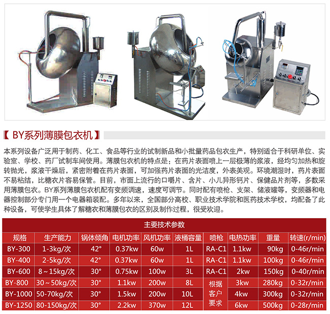 BY300型系列薄膜包衣機(jī),是我廠近三年的改進(jìn)型產(chǎn)品,本產(chǎn)品配有變頻調(diào)速,速度可在每分鐘5-50轉(zhuǎn)之間調(diào)整。本機(jī)同時(shí)配有噴槍、支架、裝液瓶等,變頻器和電器控制部分專門用一個(gè)電器箱裝配。該產(chǎn)品廣泛用于制藥、化工、食品等行業(yè)的試制新品和小批量藥品包衣生產(chǎn),特別適合于科研單位、實(shí)驗(yàn)室、學(xué)校、藥廠試制車間使用。三年來,全國部分職業(yè)技術(shù)學(xué)院和中等醫(yī)藥技術(shù)學(xué)校,均配備了此種設(shè)備,可使學(xué)生具體了解糖衣和薄膜包衣的區(qū)別及制作過程,很受歡迎。
