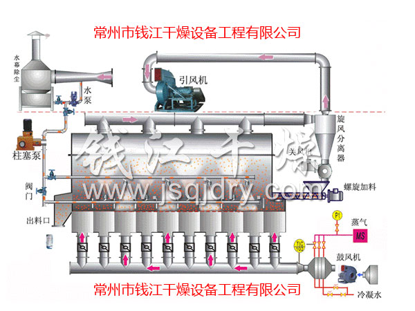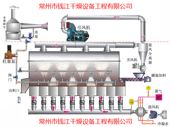 空氣經加熱器加熱后進入流化床底部,穿過分布板與物料接觸,使物料呈流態化。母液或粘結劑由壓力泵分別送到霧化噴嘴,霧化后涂布于流化顆粒表面或使顆粒相互粘結,經不斷地流化、涂布、干燥,顆粒逐漸長大,達到所要求的粒度后從流化床出料口排出。流化、霧化產生的細粉,由旋風分離器回收后,重新加入到噴霧造粒流化床中,成為新顆粒的核心,可實現流化床內顆粒數的平衡。廢氣通過旋風分離器后,經引風機至水幕除塵器除塵后放空。