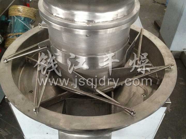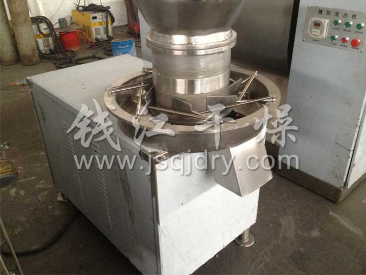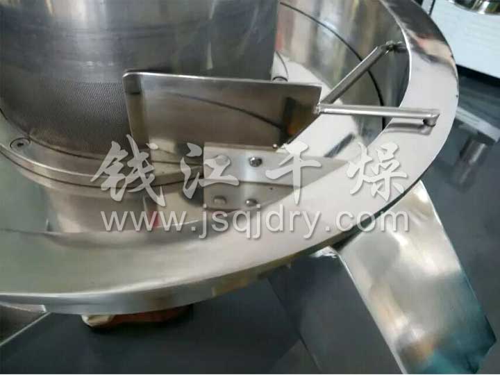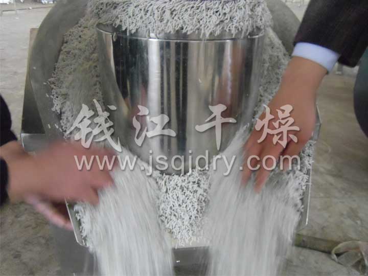 將混合均勻的軟材,在輾刀的擠壓下,使物料強制通過篩網,并受到刮刀的切割進而得到長度均勻的柱形顆粒。