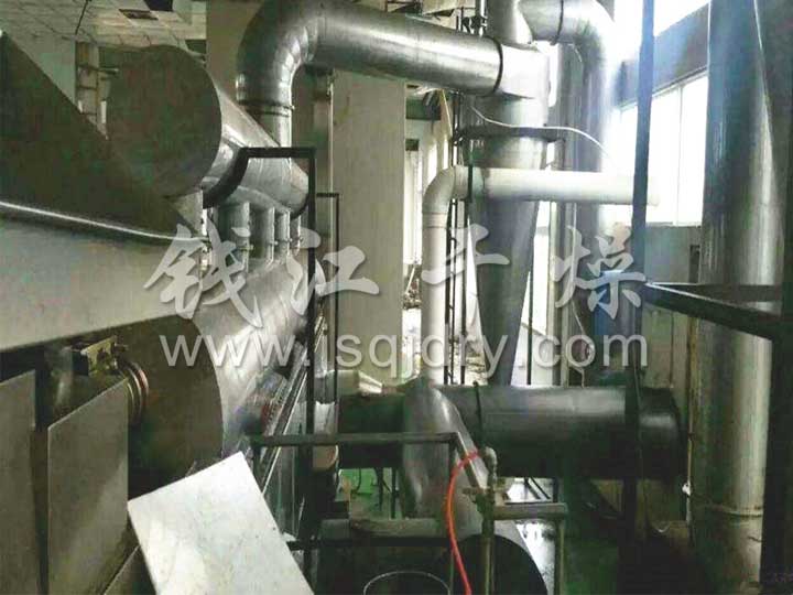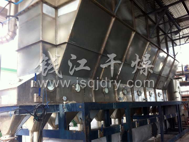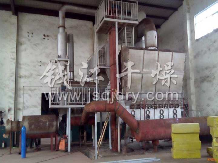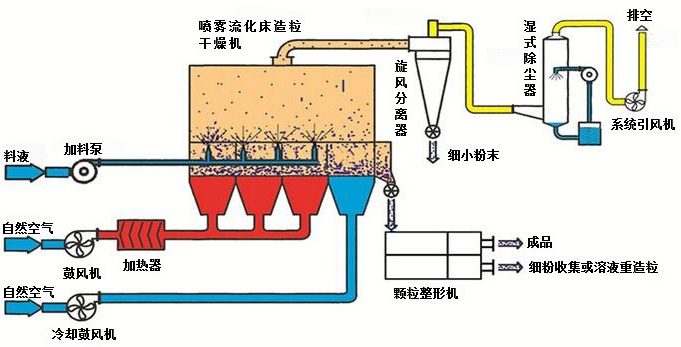 在固定流化床內部加入特殊設計的霧化器,通過霧化器將料液霧化成細小的液滴,液滴與流化床內處于流態化的不同顆粒的物料接觸,并附著在顆粒表面完成干燥造粒過程,通過調節顆粒整形系統,可以得到不同粒度的物料顆粒。