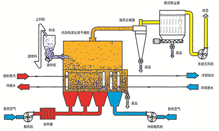 內加熱流態化干燥是在常規流化床干燥和間接傳導加熱式干燥基礎上發展起來的一種新型干燥技術。它將管式熱交換器浸沒在流態化干燥物料中,物料脫水所需熱量由內加熱交換器和流化用熱空氣共同提供,實現對流和傳導換熱一體化,以較少的風量滿足物料流態化干燥的要求。