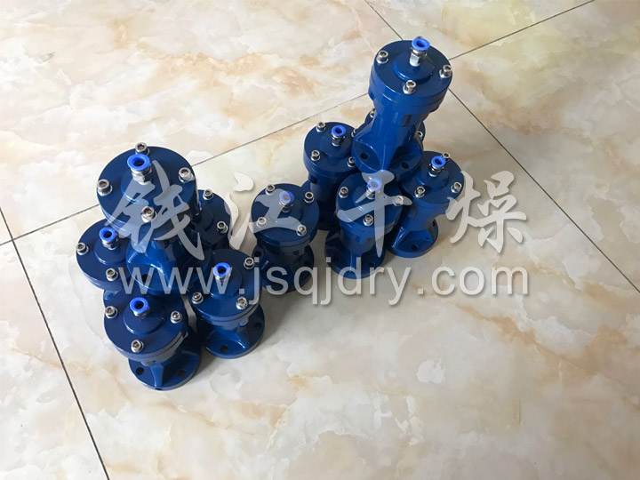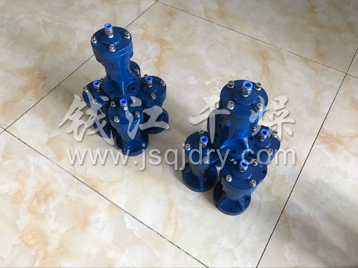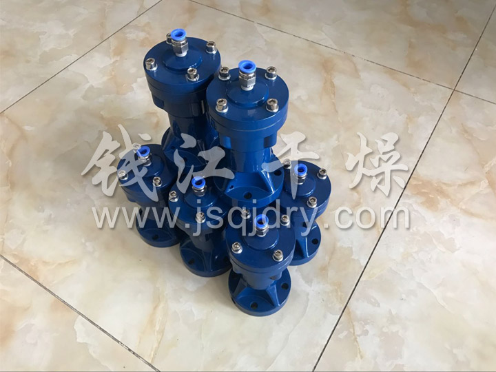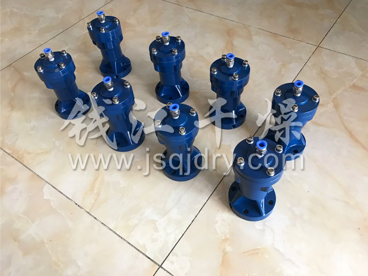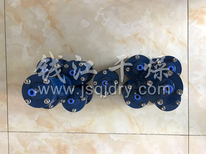 空氣錘錘頭內部有一強磁力磁鐵,在未動作前,磁性錘頭緊貼在磁力基板上。當三通電磁閥通電,進氣壓力大于貼合磁力時,磁性錘頭高速脫離基板,向底部沖擊。沖擊后,三通電磁閥斷電,產品內氣體排除,錘頭借助彈簧回復至初始位置。空氣錘的沖擊力,傳遞到管道或桶倉壁,使物料能夠順利流動。規格及參數: