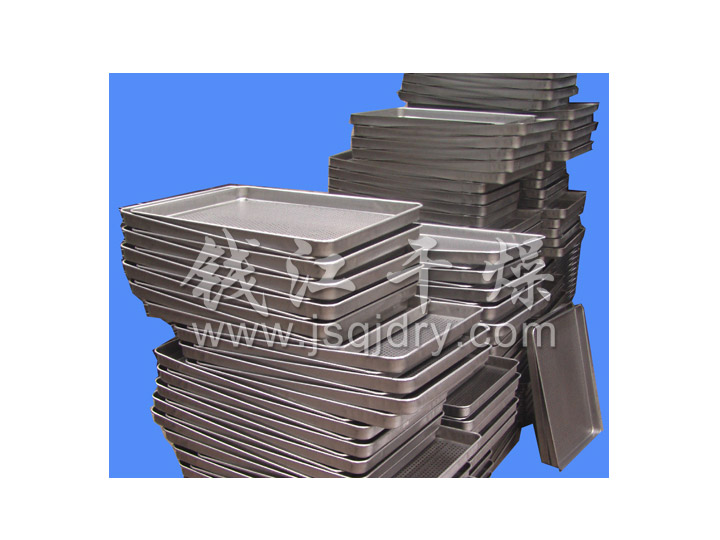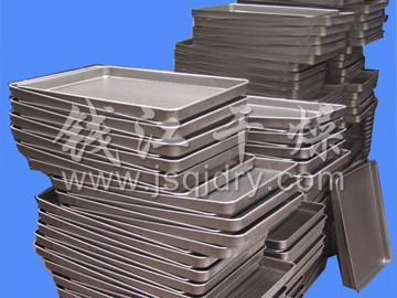 烘盤有卷邊盤和直邊盤(又稱藥品專用烘盤)兩種形式。規格:460×640×45mm。材質有:不銹鋼、鋁合金、搪瓷、聚丙烯(塑料)等,為增加透氣性,可為用戶定做各類沖孔烘盤、井字網盤,壓制盤或來料加工