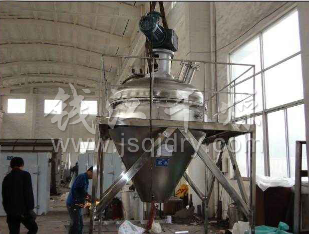 本發明的目的提出一種立式攪拌真空干燥形式。在夾套加熱的密閉型容器內,加入的物料在真空狀態下;隨著立式攪拌漿的不斷翻抄,物料表面不斷更新,從而加快了干燥速率,濕空氣由真空泵抽出,干燥后的物料由側面或底部排料口定時排出。