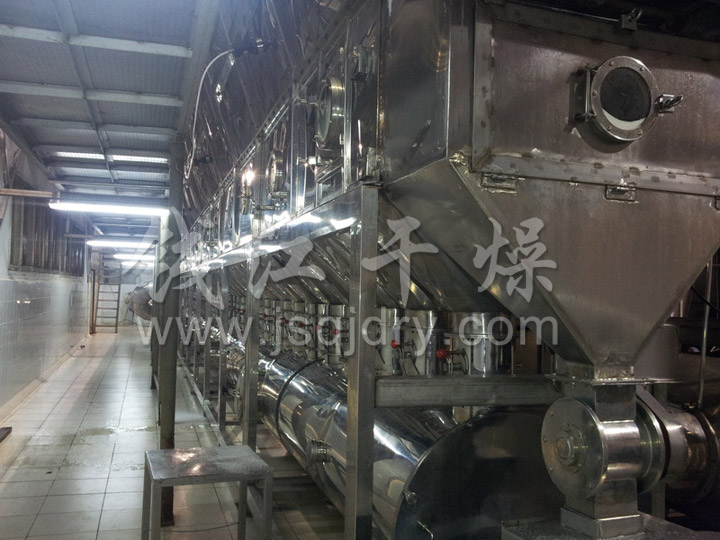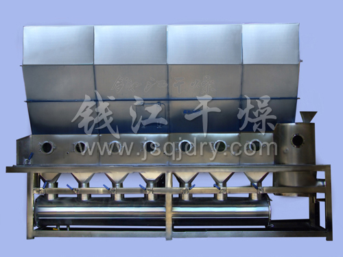 連續式流化床干燥機又稱臥式流化床干燥機。一定量的空氣經過濾、除濕(可選)、加熱后進入干燥機,進風溫度可^控制。濕物料通過加料器均勻加入流化床^室中(帶耙散裝置),與熱空氣充分接觸。經過^室后的半干產品基本呈松散狀態,保證了整個干燥過程的流化質量,^終達到產品的干燥要求。與物料接觸過的夾帶細粉廢氣,憑藉設備體積擴張原理,在干燥室內使細粉達到理想的沉降速度,從而使排出空氣的細粉含量降到^低。廢氣經旋風分離器、布袋除塵器除塵后再經水幕除塵器洗滌后放空。